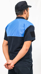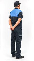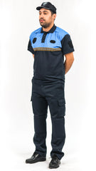De color azul marino que lleva en la parte alta del pecho y espalda un canesú de color azul claro, con fita refletante cosido entre ambos colores.Hombreras y cuello camisero de color azul marinoen el mismo tejido que el cuerpo, cerrado por tres botones del mismo color azul marino.