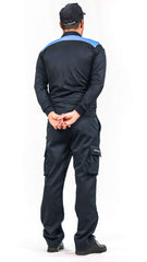 De color azul marino que lleva en la parte alta del pecho y espalda un canesú de color azul claro, con un vivo gris reflectante de 4 milímetros de ancho en la parte alta del pecho y espalda, tipo cordón, cosido entre ambos colores. Hombreras y cuello camisero de color azul marino en el mismo tejido que el cuerpo, cerrado por tres botones del mismo color azul marino.