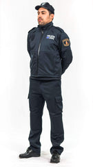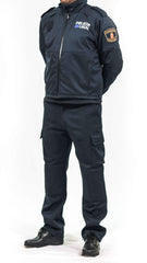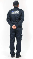 De color azul marino con un vivo gris reflectante de 4 milímetros de ancho en la parte alta del pecho y espalda, tipo cordón, cosido entre ambos colores.