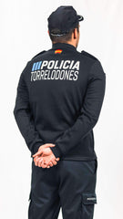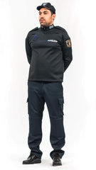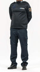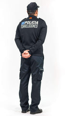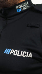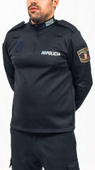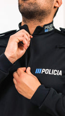 Con cremellera ykk en el cuello. A la altura del hombro  y metido en la costura de únion con la manga llevará una galonera de color azul noche , que permite colocar las divisas.